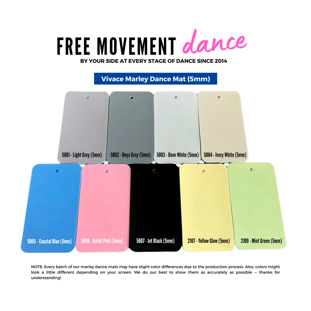 Whether at home or in commercial studios, our Vivace Marley Mat delivers top-tier performance. It’s lightweight, portable, and can be easily rolled up and stored, making it perfect for dancers on the move. It’s also waterproof, fire-resistant, wear-resistant, and shock-absorbing — ideal for spins, jumps, and floor work. Plus, it lays seamlessly over any hard, smooth surface (just avoid carpet).