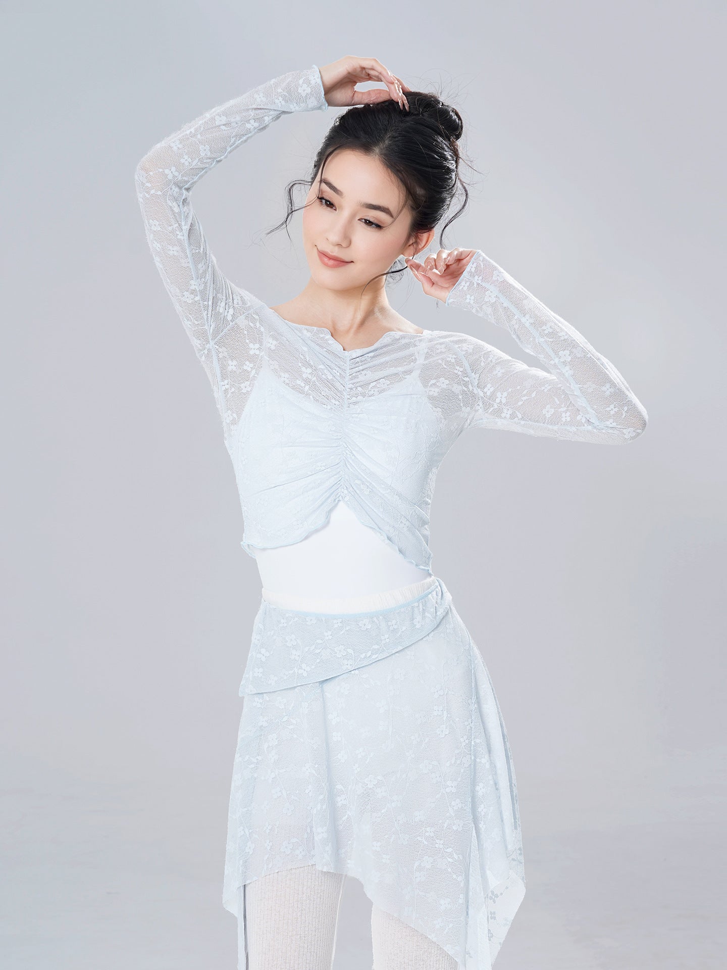 The fitted long sleeves and ruched front detail gently contour the body, while the breathable gauze-style mesh allows freedom of movement during barre, center, and rehearsal.