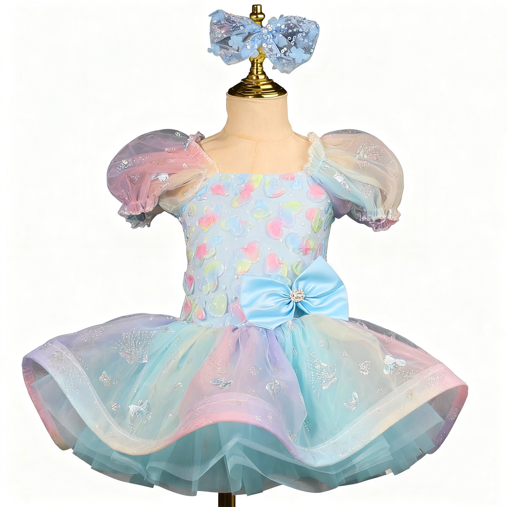 The voluminous layered tutu skirt creates a lively puffy silhouette that moves gracefully with spins, jumps, and performance choreography. Soft puff sleeves add a playful princess-inspired touch, while the large decorative bow at the waist enhances the costume’s elegant design.