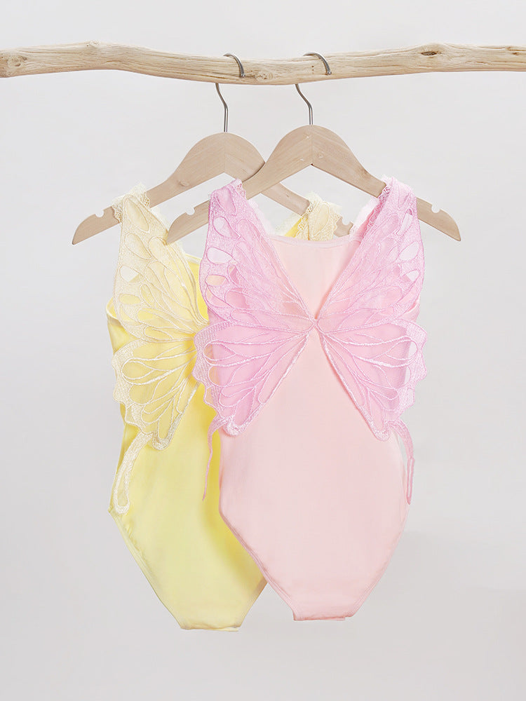 The standout feature is the delicate butterfly wing back detail, adding a whimsical princess-inspired touch while maintaining a secure and comfortable fit. Lace-trim shoulder straps and a smooth bodice silhouette create a refined look suitable for studio classes, spring recitals, and themed performances.